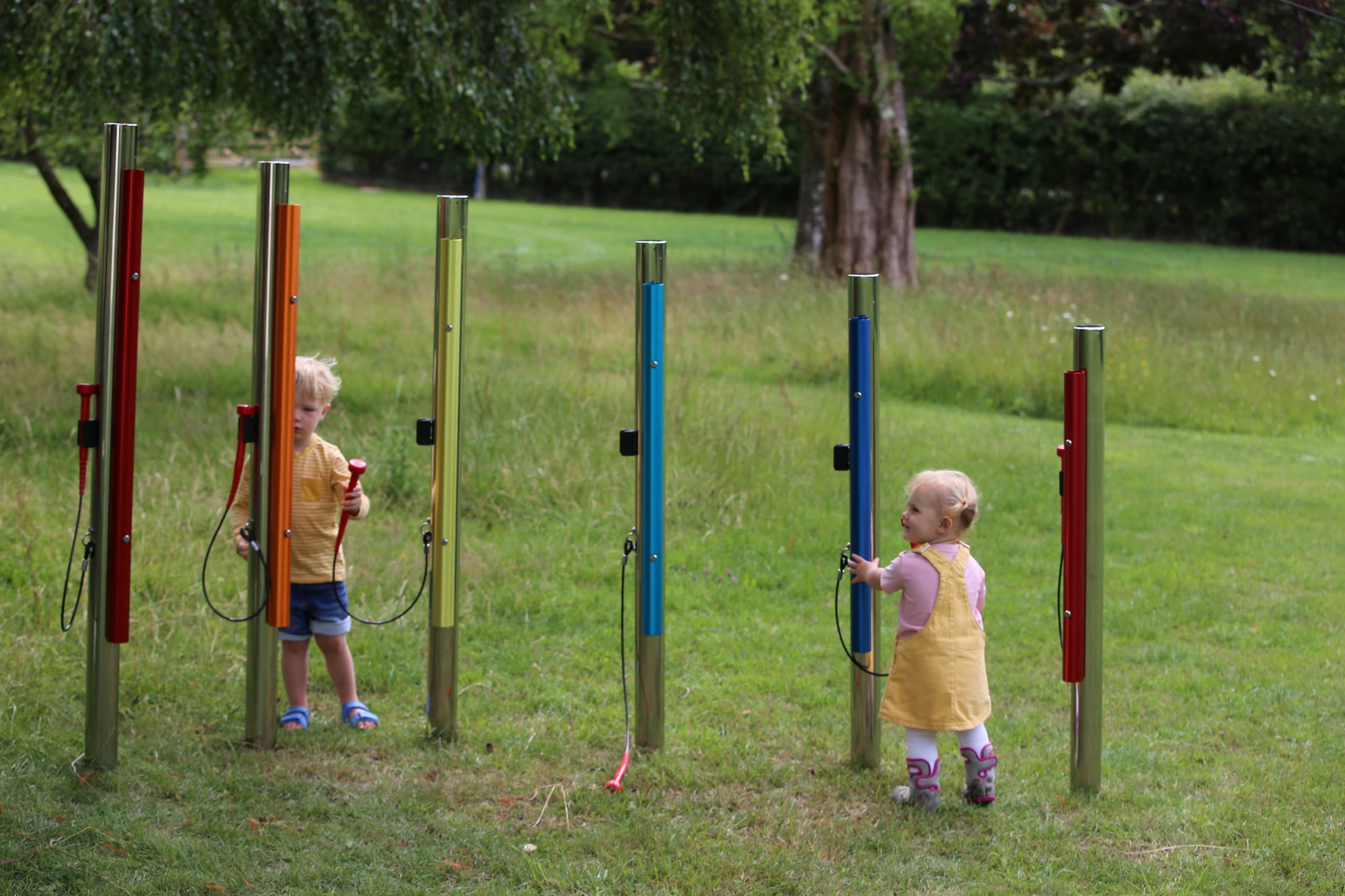 Calypso Chimes are the perfect addition to your outdoor play space. Players of every age and ability will love this easy-to-play instrument. The pentatonic scale means no sour notes! Players build confidence when they create beautiful melodies on these chimes. Each note produces a clear, lively tone with a long sustain.
