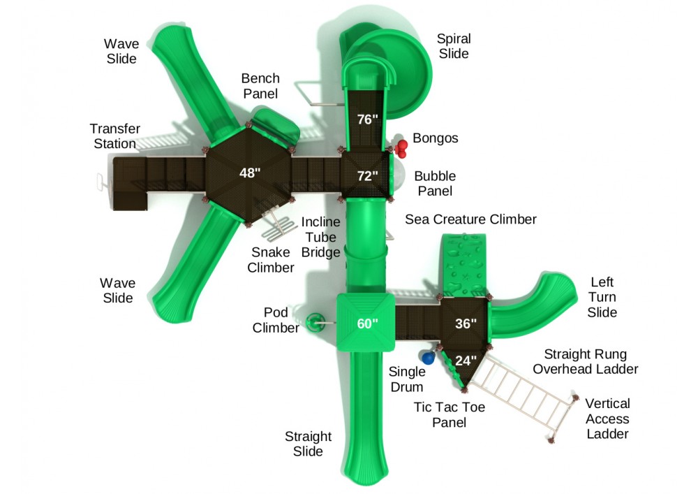 The adventure starts on the ground level with the Chagrin Falls play structure as dotted around the base are Bongos, a Bench Panel, and a Single Drum, as well as a Tic Tac Toe Panel to help develop cognitive abilities. Climbing onto the structure can be done in many ways to give kids the choice of easy, medium or hard. Starting off easy, they can choose the Transfer Station or the Snake Climber, which is accessible for all ages. Still, they can opt for a slightly trickier ascent on the Pod Climber for a medium-level difficulty, where balance and skill are required.