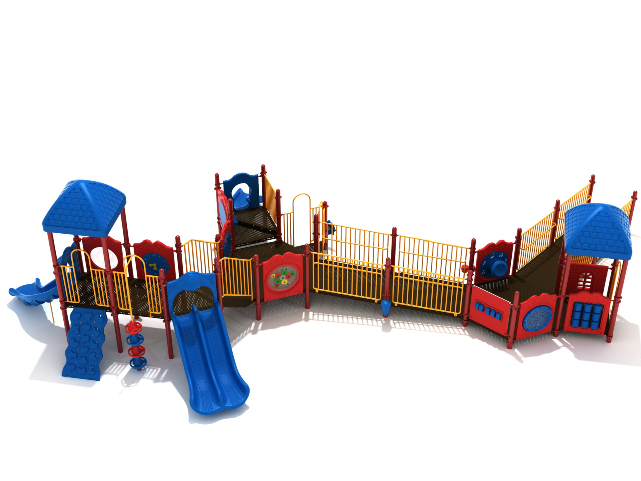 Cherry Valley is an expansive, adventure-filled play structure that encourages fun and imagination for children of all abilities. It includes 4 slides—such as a Double Slide and 2 Right Turn Slides—along with a Figure and Pod Climber designed with ergonomic handholds to support strength and coordination.