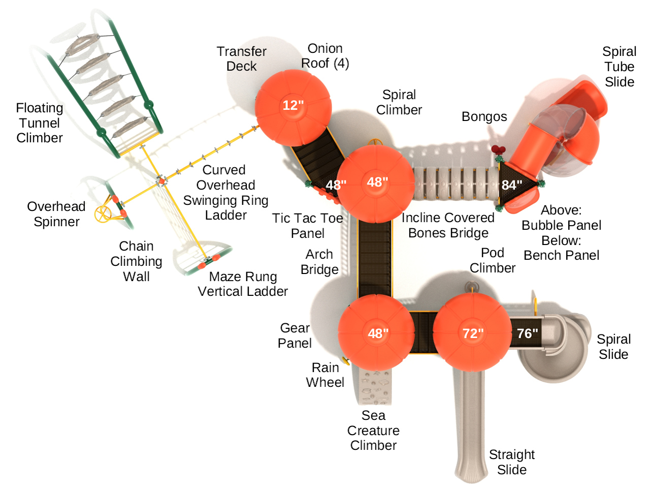 Pantigo is a playground masterpiece crowned with four large Onion Roofs, sparking imaginative play as a castle to conquer or a palace to explore. Adventurers can zoom down the long Straight Slide, twist through the Spiral Slide, or glide inside the Spiral Tube Slide with transparent sections for extra excitement. Children can carefully cross the Incline Covered Bones Bridge, challenge friends on the Tic Tac Toe Panel, unwind at the Bubble Panel, or spin the Gear Panel. The Sea Creature Climber lets kids climb with turtles and starfish, while the Pod Climber and Spiral Climber offer versatile routes up and down. On the main play area, young explorers can swing on the Curved Overhead Swinging Ring Ladder, tackle the Chain Climbing Wall, crawl through the Floating Tunnel Climber, spin on the Overhead Spinner, or ascend the Maze Rung Vertical Ladder, creating endless opportunities for fun, adventure, and skill-building.