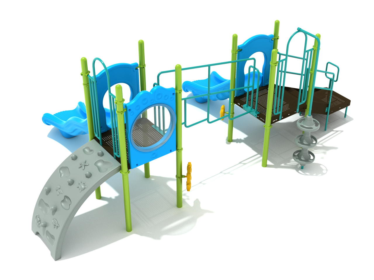 The Ponce Inlet play structure may be simple, but it offers plenty of fun with two decks connected in a creative way. Kids can reach the decks through the Transfer Station, or challenge themselves on the Spiral Climber or Sea Creature Climber. The two decks are linked by a Mountain Climber Bridge, adding another exciting way to move between play areas.