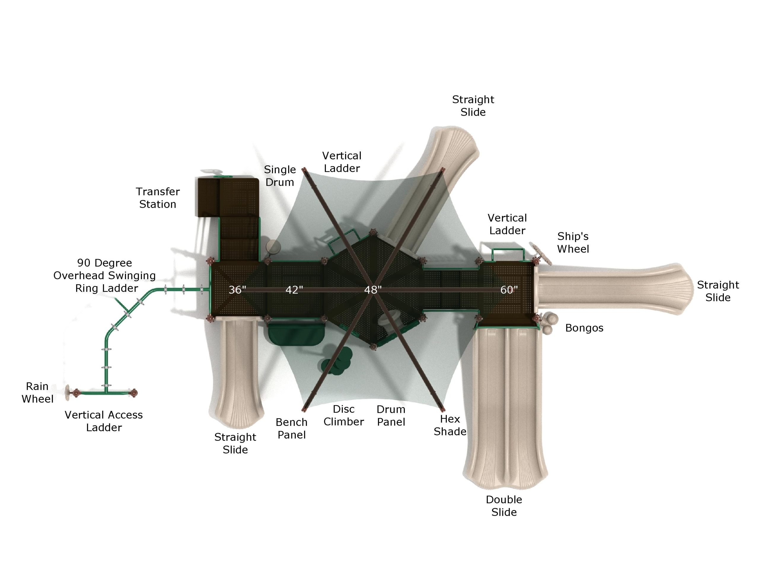 The system is also equipped with a drum panel and bongos, along with a stylish bench panel for creating music and taking breaks. Additionally, the disc climber and transfer station provide accessible and diverse ways to reach the play decks, ensuring that everyone can join in the fun. With its bright colors, durable construction, and thoughtfully designed features, the Skyward Shade serves as a perfect centerpiece for parks, schools, or community spaces, encouraging active play and creative exploration for hours on end.