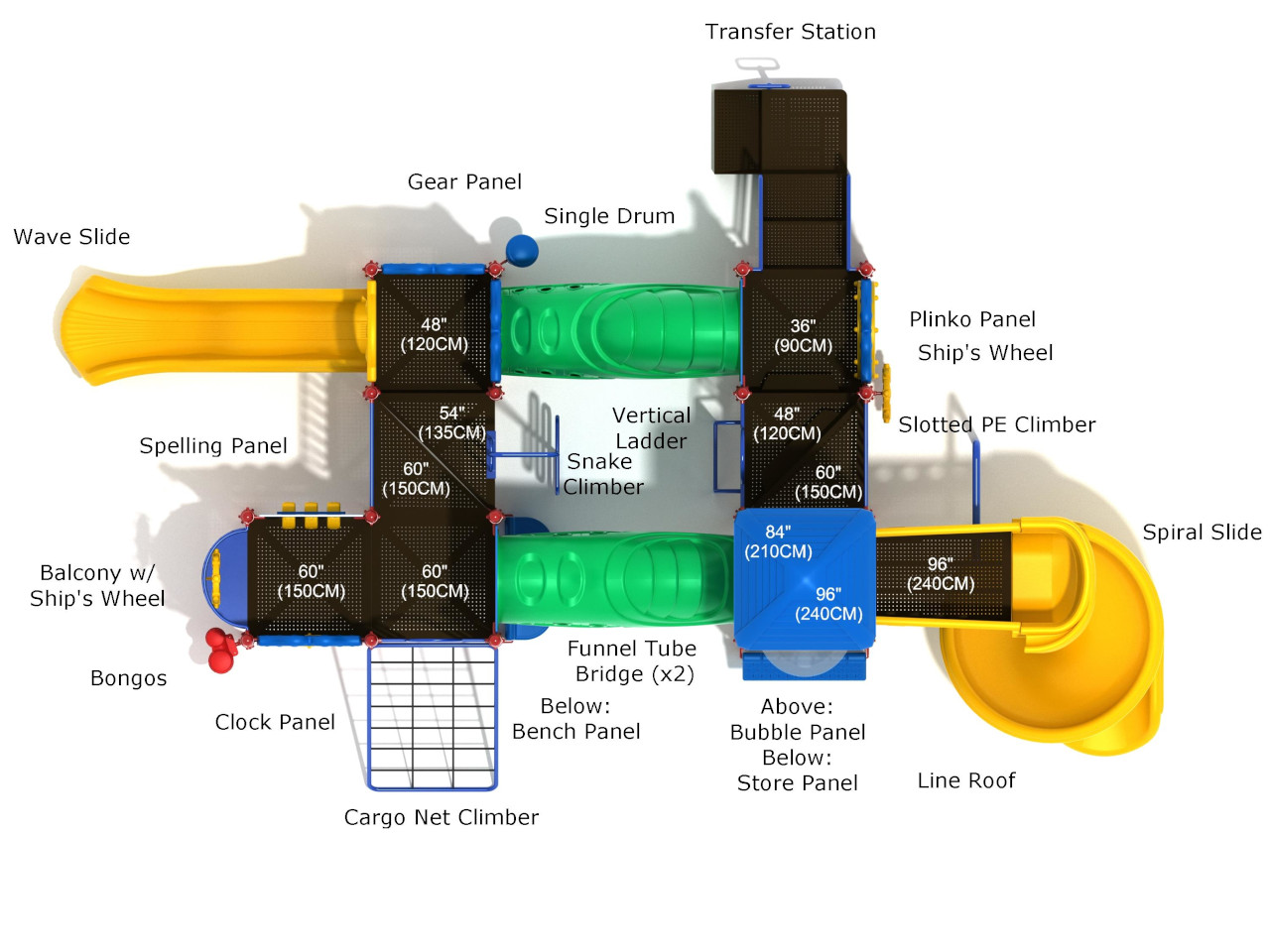 Interactive elements include Plinko and Gear Panels, along with a Ship’s Wheel and musical features such as Bongos and a Single Drum to encourage creative role-play. Climbing options like the Snake Climber and Slotted PE Climber add physical challenge and friendly competition, while the Spelling Panel and Clock Panel introduce opportunities for educational play. Soda Springs delivers a well-rounded play experience that blends movement, learning, and imagination.