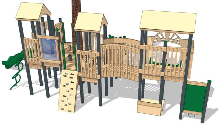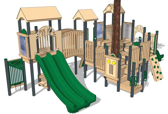 Discover the “Treehouse” playset—your ultimate solution for commercial playgrounds that adhere to all safety design codes! This innovative design makes the most of small spaces by cleverly wrapping around and under trees in your area. We proudly call it the Tree Hugger, a fitting name as it embraces nature and is crafted from recycled materials, catering to eco-conscious users.
