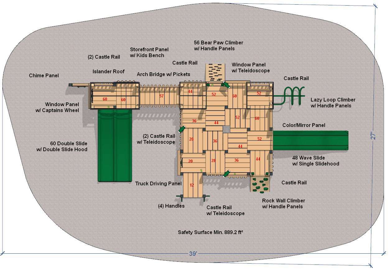 Children will embark on endless adventures with features like a Rock Wall Climber, Bear Paw Climber, Lazy Loop Climber, and an Arch Bridge with Pickets. The excitement continues with a Double Slide and a Wave Slide! Additional elements such as a Chime Panel, Truck Driving Panel, Window Panels, Teleidoscopes, Castle Rails, and an Islander Roof ensure every child has something to explore.