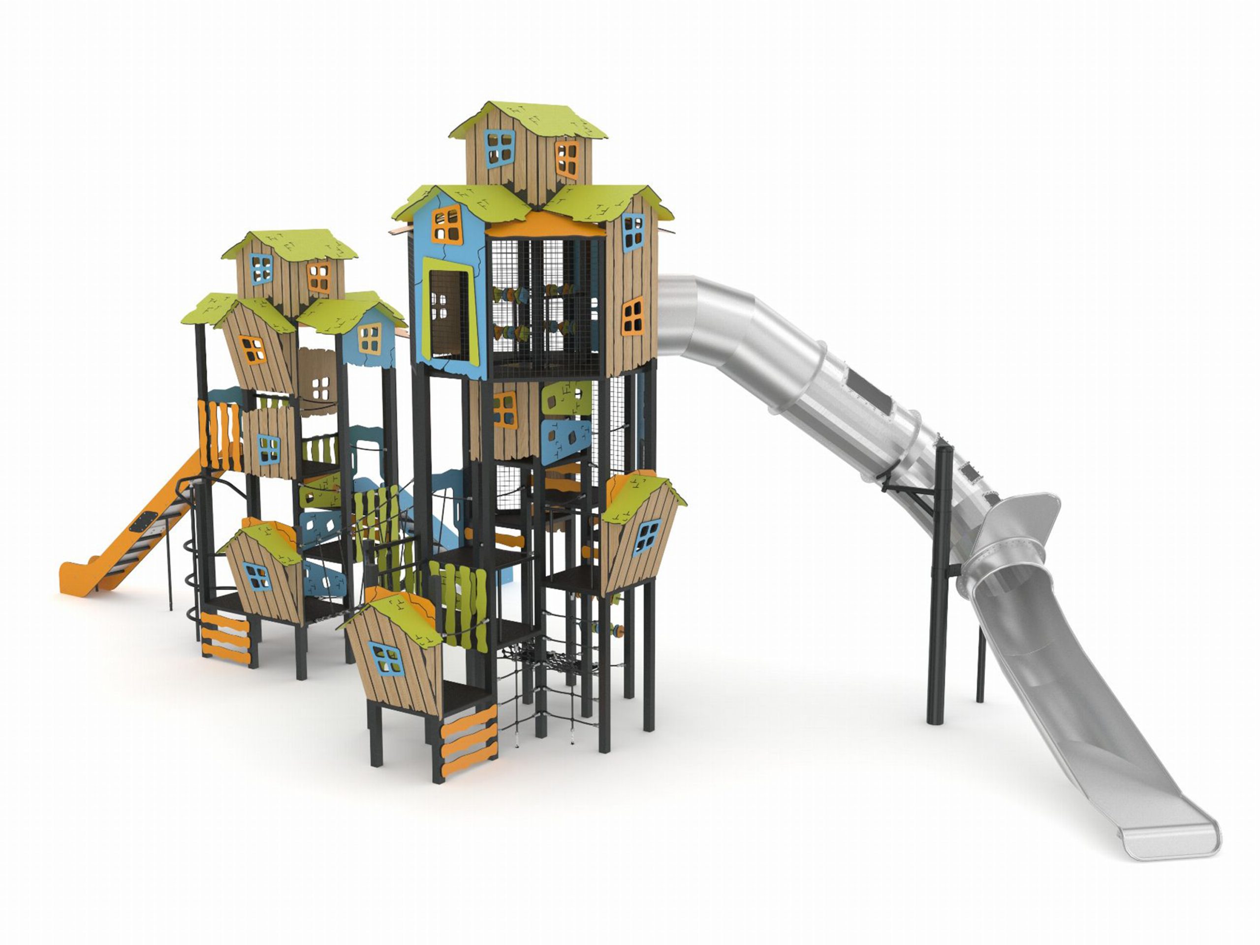 The structure features multiple floor levels and platform heights, providing a range of play opportunities. It includes climbing stations, rope bridges, slides, and interactive games on panels, all of which foster a dynamic and engaging play environment.