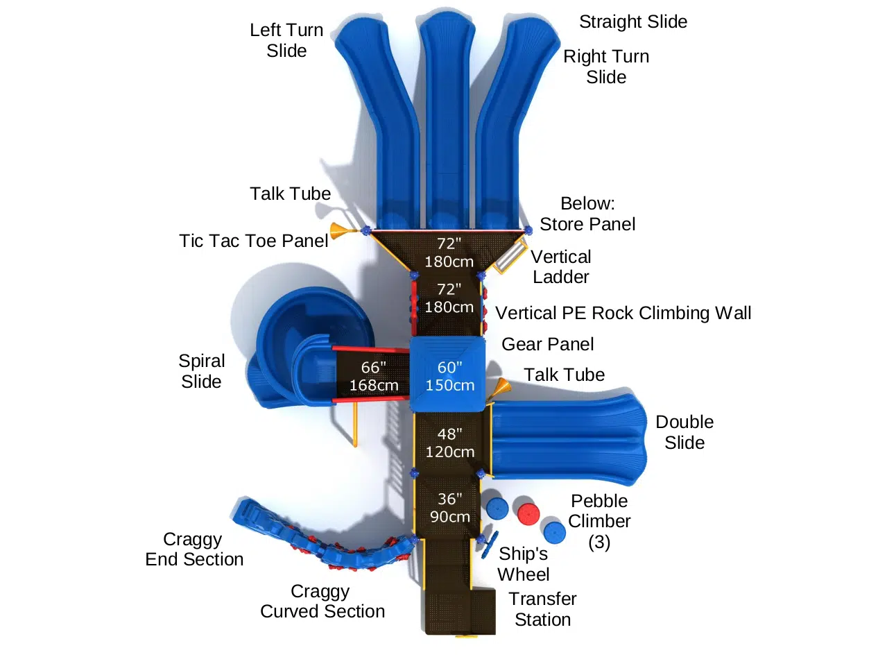 Climbing options include Craggy End and Craggy Curved Sections for different rock-climbing challenges, along with a Vertical Rock Climbing Wall for an easier ascent. Three Pebble Climbers lead to interactive elements like Tic Tac Toe and Gear Panels. Social and imaginative play is encouraged through Talk Tubes, a Store Panel for role-play, and a Ship’s Wheel that invites endless pretend adventures.